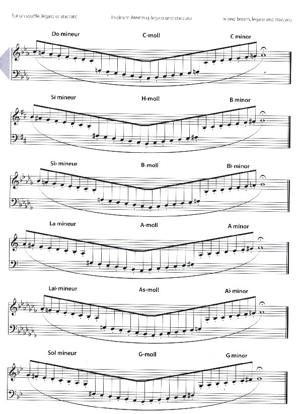 3) Complete scales, written out in all major and minor tonalities with articulation alternatives