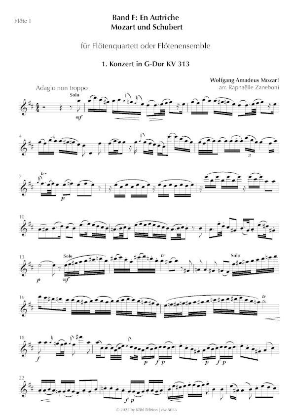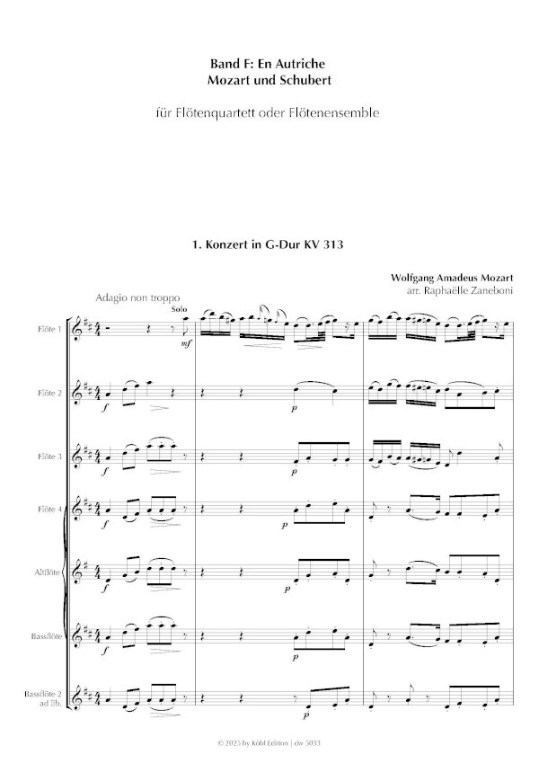 1. Wolfgang Amadeus Mozart, Konzert für Flöte und Orchester in G-Dur KV 313 Arr. für Flötenquartett oder Flötenensemble (fünf Stimmen) von Raphaëlle Zaneboni