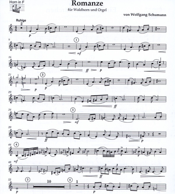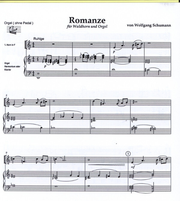 Romanze für Waldhorn und Orgel, Klavier oder Harmonium. Bei dieser Komposition handelt es sich um Musik, die durchaus der Romantik zugeordnet werden kann. Das Stück wird von zwei Themen bestimmt, die in verschiedenen Versionen auftauchen.