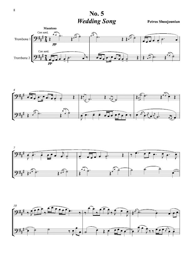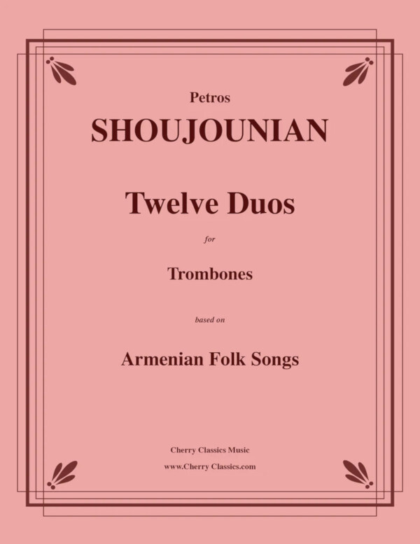 Petros Shoujounian, an Armenian/Canadian composer has written Twelve Duos for Trombones based on the folksong collection of the Armenian priest Komitas, known as the founder of the Armenian national school of music and one of the pioneers of ethnomusicology. Below are comments from the composer about his inspiration in writing these Twelve Duos for Trombones.