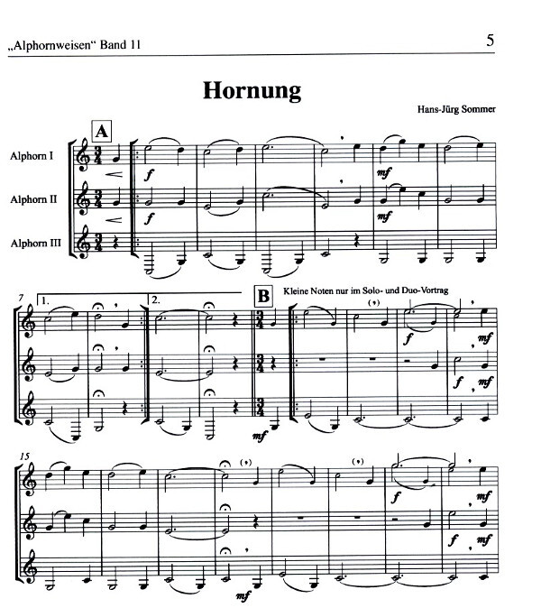 Sammelband mit Alphornweisen in unterschiedlichen blastechnischen Schwierigkeitsgraden und unterschiedlicher Besetzung (Solo, Duo, Trio, Quartett oder Gruppe).