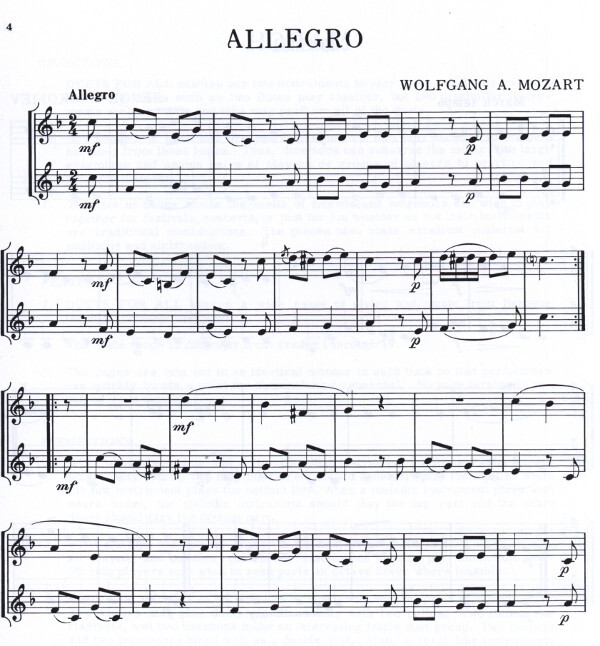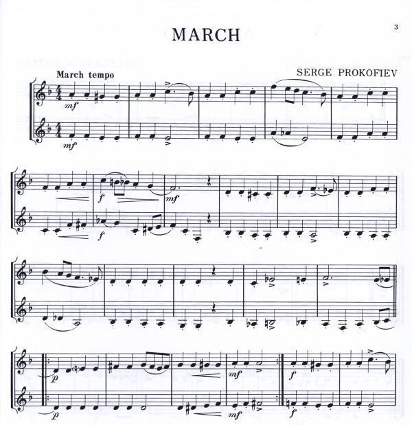 Duets for All enables any two instruments to play duets. Not only may two like-instruments such as two flutes play together, but two dissimilar instruments such as violin and tuba may perform all of the duets. The duets cover a wide range of styles and music from baroque through contemporary eras, and they range in difficulty from grades I through IV. Prokofieff: Marche
