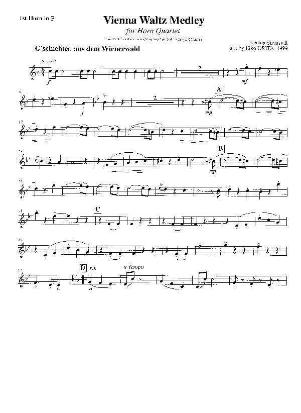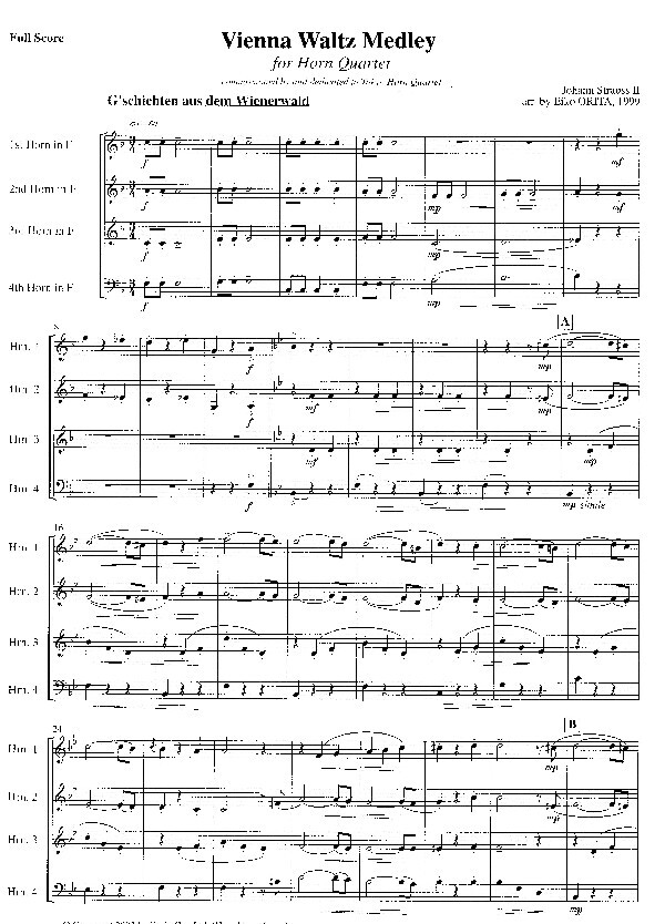ein Medley mit den bekanntesten Walzern von Johann Strauß Dieses Stück wurde 1999 für das Tokyo Horn Quartet geschrieben und von dem Ensemble noch im selben Jahr auf der CD Dance Marche eingespielt. Dieses Medley enthält die bekanntesten Melodien des "Walzerkönigs" Johann Strauß (Sohn) Die oberen Lagen können für manche Spieler eventuell etwas anspruchsvoll sein, daher kann man manche Passagen eine Oktave tiefer spielen.