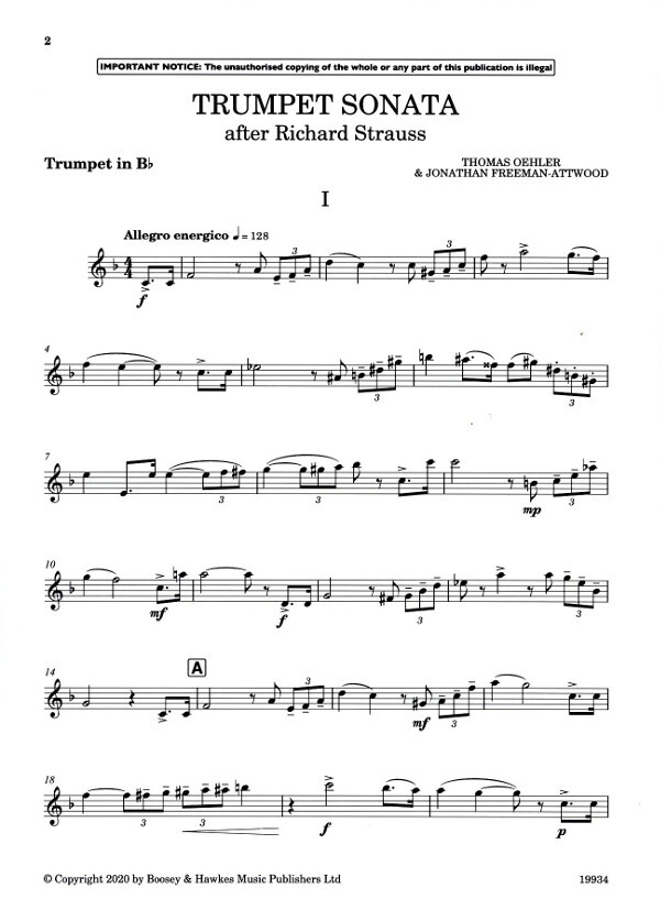 Thomas Oehler und Jonathan Freeman-Attwood haben sich an der großen Fülle von Strauss Werken bedient, um dieses neue Angebot zu erstellen, und dabei auf Stücke wie die Violinsonate, Von den Hinterweltlern (Also sprach Zarathustra), der Serenade für 13 Blasinstrumente und Zerbinettas Arie (Ariadne auf Naxos) zurückgegriffen. Die Ausgabe enthält Stimmen für Trompete in B und C.