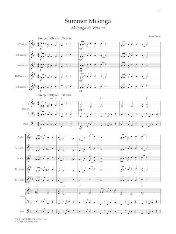 Within the majority of the series (lines may vary dependent on style and tradition) the melody line is doubled on C and Bb instruments, there are C, Bb and Eb harmony parts, a bass line, an easy keyboard part and chord symbols, and vibrant and varied percussion parts.