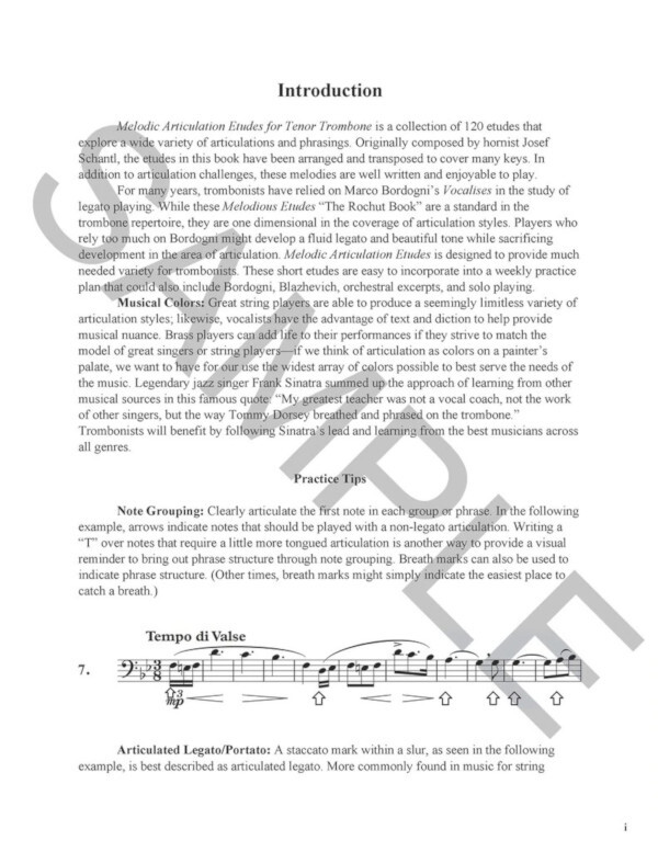 120 Melodic Articulation Etudes for Tenor Trombone by Josef Schantl, edited by Donn Schaefer, is appropriate for high school through professional trombone players.