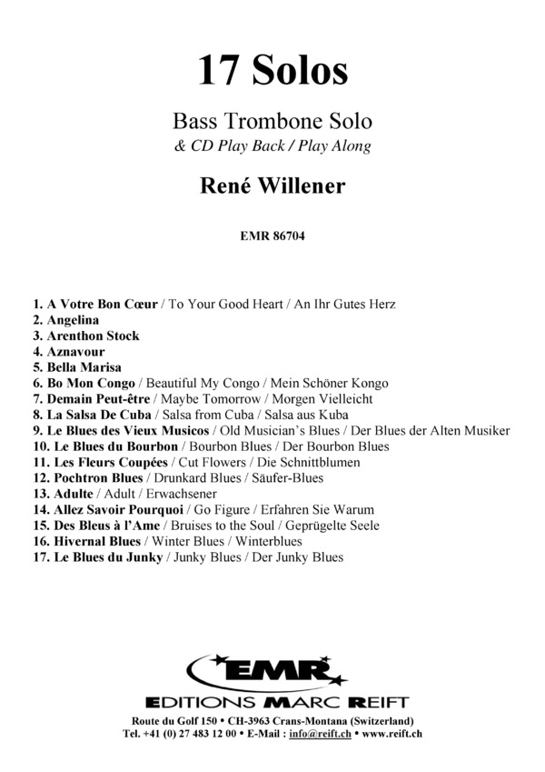 1. A Votre Bon Coeur (To Your Good Heart / An Ihr Gutes Herz) / 2. Angelina / 3. Arenthon Stock / 4. Aznavour / 5. Bella Marisa / 6. Bo Mon Congo (Beautiful My Congo / Mein Schöner Kongo) / 7. Demain Peut-être (Maybe Tomorrow / Morgen Vielleicht) / 8. La Salsa De Cuba (Salsa from Cuba / Salsa aus Kuba) / 9. Le Blues des Vieux Musicos (Old Musician's Blues / Der Blues der Alten Musiker) / 10. Le Blues du Bourbon (Bourbon Blues / Der Bourbon Blues) / 11. Les Fleurs Coupées (Cut Flowers / Die Schnittblumen) / 12. Pochtron Blues (Drunkard Blues / Säufer-Blues) / 13. Adulte (Adult / Erwachsener) / 14. Allez Savoir Pourquoi (Go Figure / Erfahren Sie Warum) / 15. Des Bleus à l'Ame (Bruises to the Soul / Geprügelte Seele) 16. Hivernal Blues (Winter Blues / Winterblues) / 17. Le Blues du Junky (Junky Blues / Der Junky Blues)